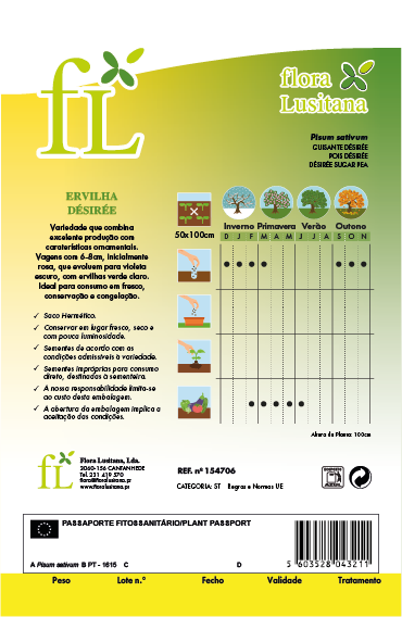 INFORMAÇÕES COMPLEMENTARES: Variedade que combina excelente produção com caraterísticas ornamentais. Vagens com 6-8cm, inicialmente rosa, que evoluem para violeta escuro, com ervilhas verde claro. Ideal para consumo em fresco, conservação e congelação.